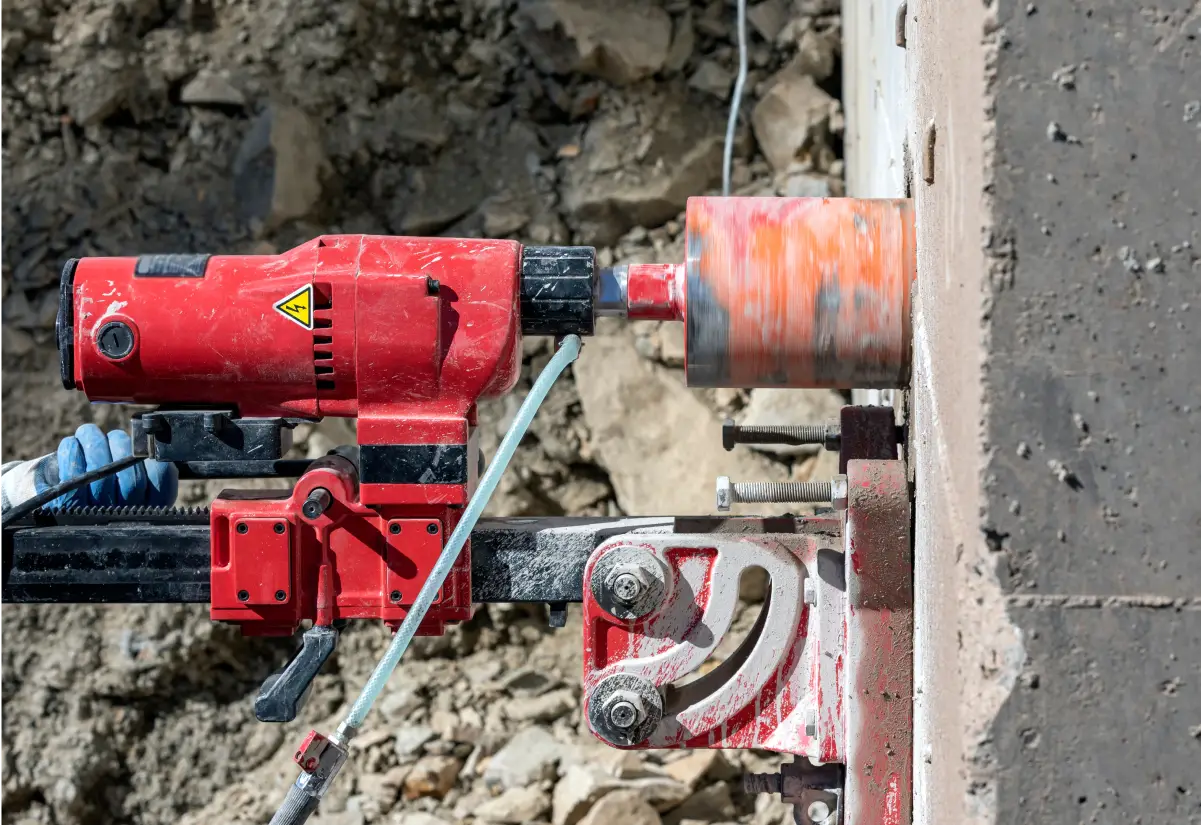 Bei Luft-Wasser-Wärmepumpen im Monoblock ist es meist notwendig, für die Leitungen ein 10 cm großes Loch in die Hauswand zu bohren. Dazu verwenden wir eine Kernbohrmaschine, die ein sauberes Loch herausschneiden kann.